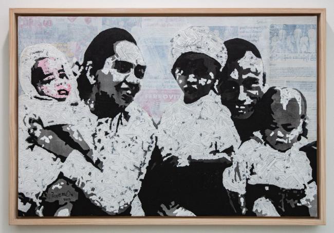 The monochromatic painting reproduces an intimate photograph of General Aung San with his young family. The infant Aung San Suu Kyi is highlighted in pink. A revolutionary hero and founder of the Union of Burma, General Aung San was assassinated in 1947, six months before Burma's independence from British colonial rule.