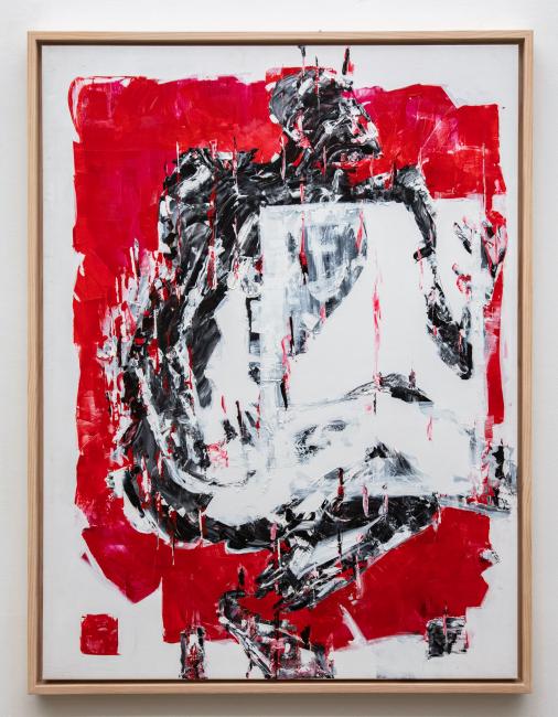 This powerful painting is part of an eponymous series completed in 2014. Formally linked by a red, white and black chromatic schema and by broken and agitated brushwork that charge the imageries with urgent tension, the series cast monks as dark figures in variously combative and abject states.