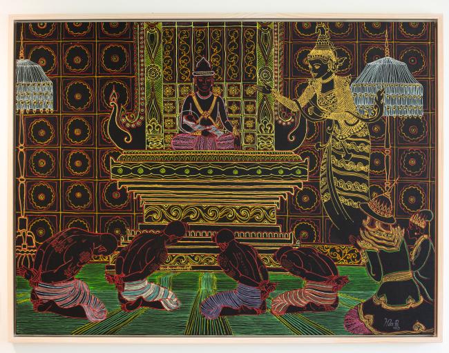 Hla Pa's painting invokes the technical and decorative sensibilities of traditional Burmese lacquerware. Hla Pa (b. 1972, Rakhine State) trained at Yangon's State School of Fine Arts and was a book and magazine illustrator before becoming a full-time artist in 2010.