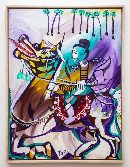 Against a background composed of swirling Fauvism colours of varying shades of purple, green and yellow, is a heroic-looking man in the dress and style that suggest a timeless past. He sits astride a horse bedecked in tassels and garlands. The horse's head is pointed up, its row of straight teeth baring aggressively. Geometric patterns within the horse's head point to the influence of Cubism. The artist Aung Khaing, born 1945 in Yangon, is a self-taught artist whose early lessons came via books on Western Modernism as well as Burmese pioneer modernists Aung Soe and Maung Ngwe Tun. The influence of 20th century modernism is clear in his stylistic references, and especially in the homage to Picasso's Cubist horse from his 1937 painting Guernica.