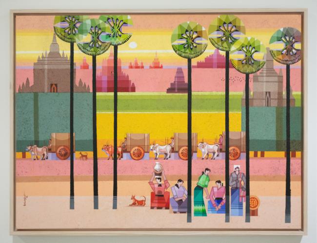 "I painted a group of people going to the Ananda Pagoda Festival in Bagan… We Bamar travel in groups for pagoda festivals. In the villages, they use bullock carts. This subject had been in my heart for a long time, so I painted it. In Myanmar, such scenes are quite common. You find them in Bagan today. In rural towns, they still travel by bullock cart, although people have started to use motorcycles. They've replaced the wooden wheels of bullock carts with car tyres to make life easier for the oxen."