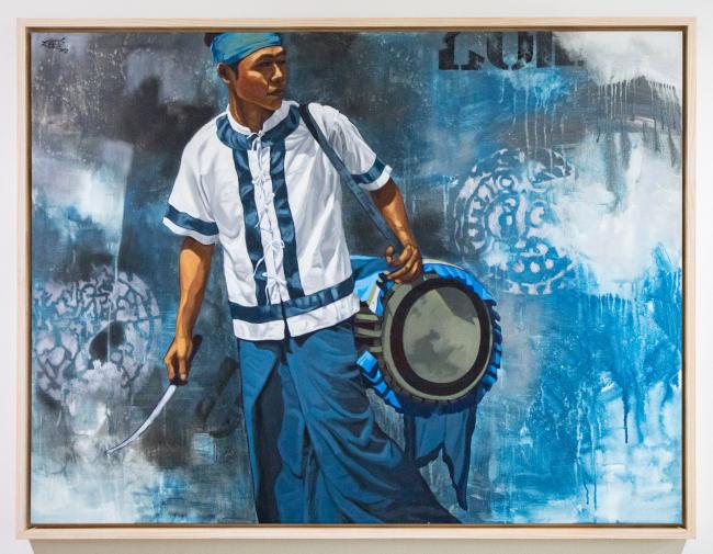 Kaung Kyaw Khine (b. 1982, Rakhine State) graduated from Yangon's State School of Fine Arts in 2007 and held his first solo exhibition in 2012. Born in Sittwe, Rakhine State, where his father U Kyaw Zan Maung is a prominent Rakhine traditional musician and leader of a large drum team, the artist has made his signature theme performers of the traditional Rakhine two-sided long drum. The drum is only played on auspicious occasions such as the ordination of monks and Rakhine Thingyan.