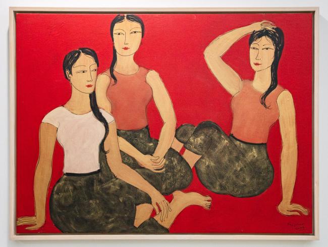 An early work from Min Zaw's signature Red Women series, this 2006 painting of three women in companionable repose is a bold statement of artistic independence made in defiance against official objections to red, reportedly objectionable because the colour relates to "war, blood, a call to action."