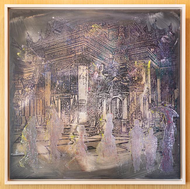 Myint San Myint (b. 1965) worked in the silkscreen printing trade before turning to full-time art making in 2009. The Yangon-based artist applies screen-printing techniques to create complex visual overlays that point at overlapping realities.