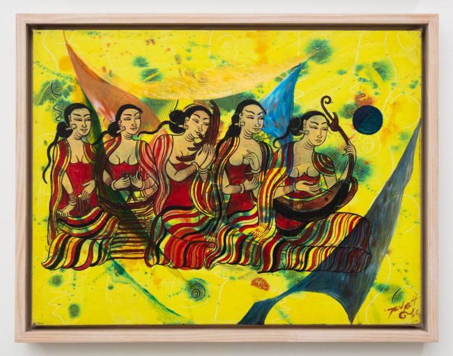 Worked in the traditional style of what the Burmese call 'one-line painting', the animated performers in Tun Tun Latt's paintings are graphically stylised with black outlines and flat colours. The chromatic schema of reds, browns, yellows, greens, black and white, mimics the colours of natural pigments used by traditional muralists.