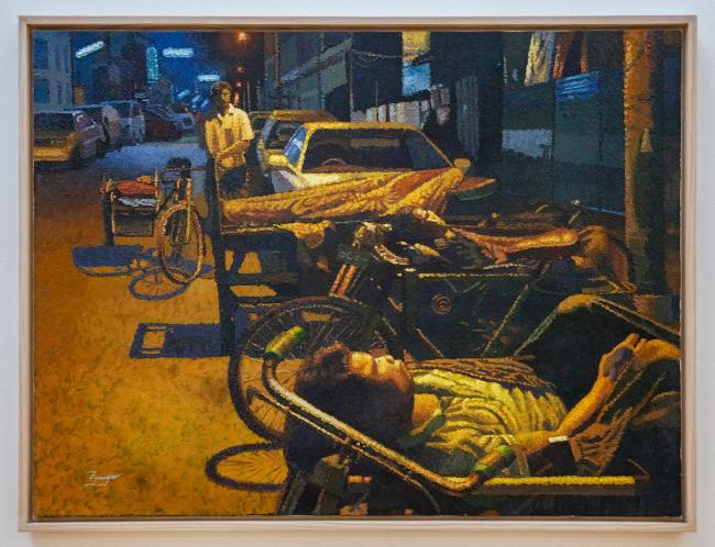 In this painting made using a palette knife, trishaw riders are shown resting at night while cars loom in the distance, signaling the end of their way of life.