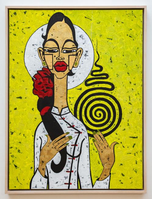 This painting belongs to the artist's signature series of portraitures in which the female figure represents both herself and Burmese women. Throughout the series, the artist reclaimed traditional symbols to send a message of empowerment. Here she has painted the woman a halo to challenge prevailing beliefs that women cannot achieve enlightenment. Similarly, she painted a mole under the eye, commonly believed to bring bad luck, to represent a woman in control of her fate.