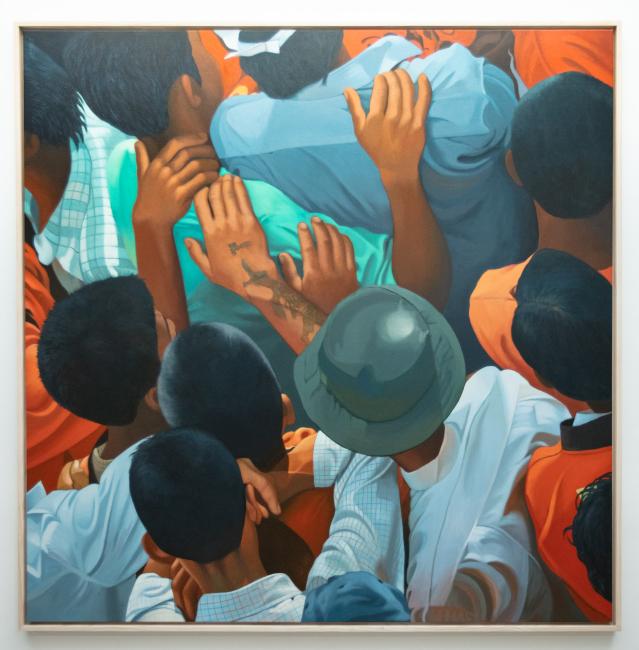 Aung Ko's tightly cropped photorealistic rendering serves as an emphatic record that captures the claustrophobia, panic and confusion that must have gripped the crowd. It conveys a human jam with hands on another's shoulder as if collectively propelling itself forward in a slow shuffle. Though titled 'We Are Moving', both the viewer and the huddled masses in the painting cannot see beyond the frame of the canvas to where the pressing crowd is moving.