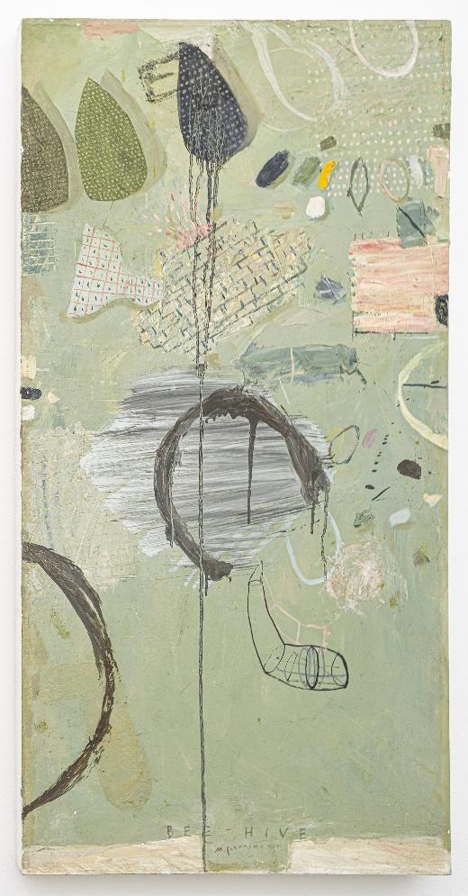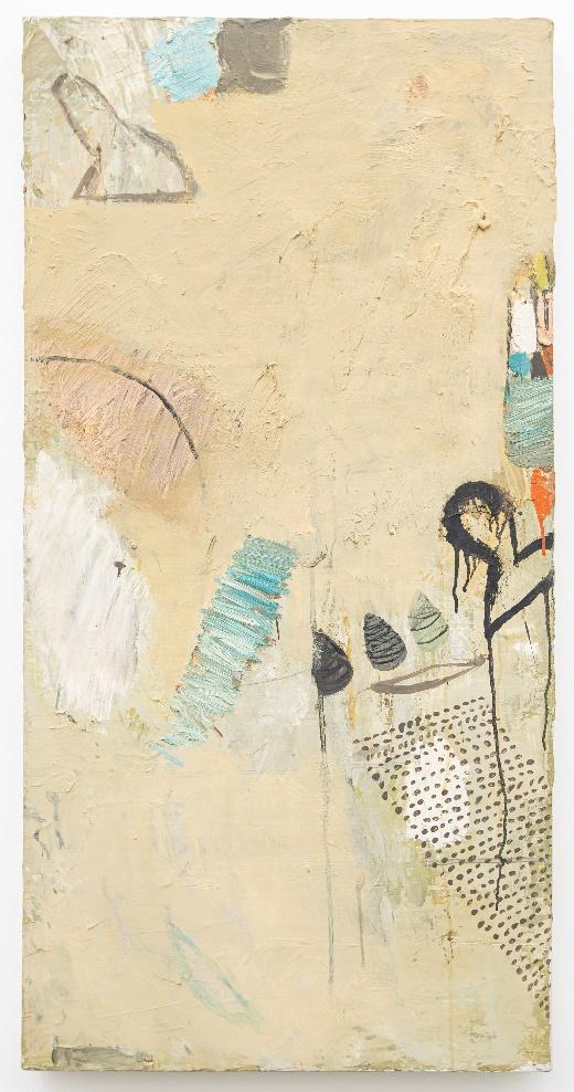 We can refer to the sand-coloured painting Visual Dictionary (2000) that is on display at the School of Economics. The abstract painting is dominated by a warm sand beige base, with a mix of soft muted tones nudged in throughout. Patches of aqua, orange, and black appear around, breaking up the neutral field and drawing the eye around the composition. Texture plays a major role in his artworks, the evidence is laid through loose, gestural strokes that wander throughout the canvas, and occasional placements of thick paint drops. Dots trail down in a slanted motion, alongside ink drips, which eventually blend in with the wave of sand beige. Situated in the middle, leaning right, stand three conic shapes, possibly a connection to the series Bee-Hive (2001).